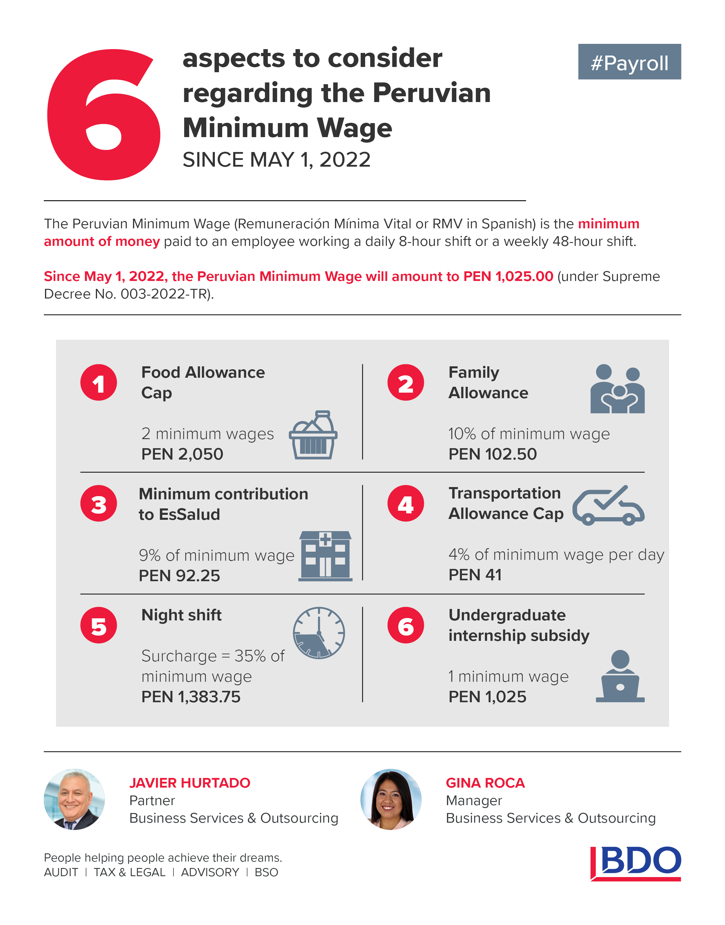The Peruvian Minimum Wage (Remuneración Mínima Vital or RMV in Spanish) is the minimum amount of money paid to an employee working a daily 8-hour shift or a weekly 48-hour shift. Since May 1, 2022, the Peruvian Minimum Wage will amount to PEN 1,025.00 (under Supreme Decree No. 003-2022-TR).