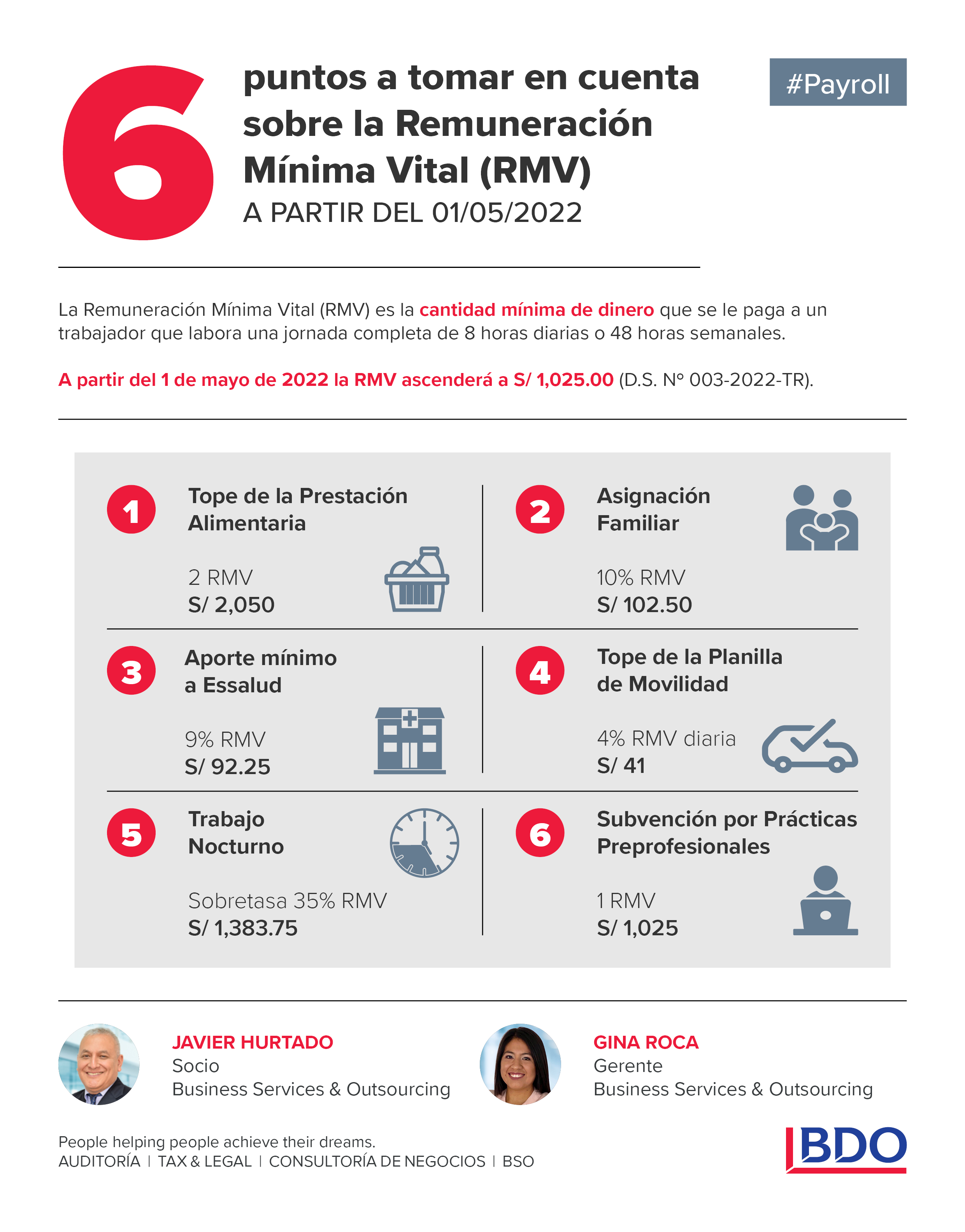 La Remuneración Mínima Vital (RMV) es la cantidad mínima de dinero que se le paga a un trabajador que labora una jornada completa de 8 horas diarias o 48 horas semanales. A partir del 1 de mayo de 2022 la RMV ascenderá a S/ 1,025.00 (D.S. Nº 003-2022-TR).