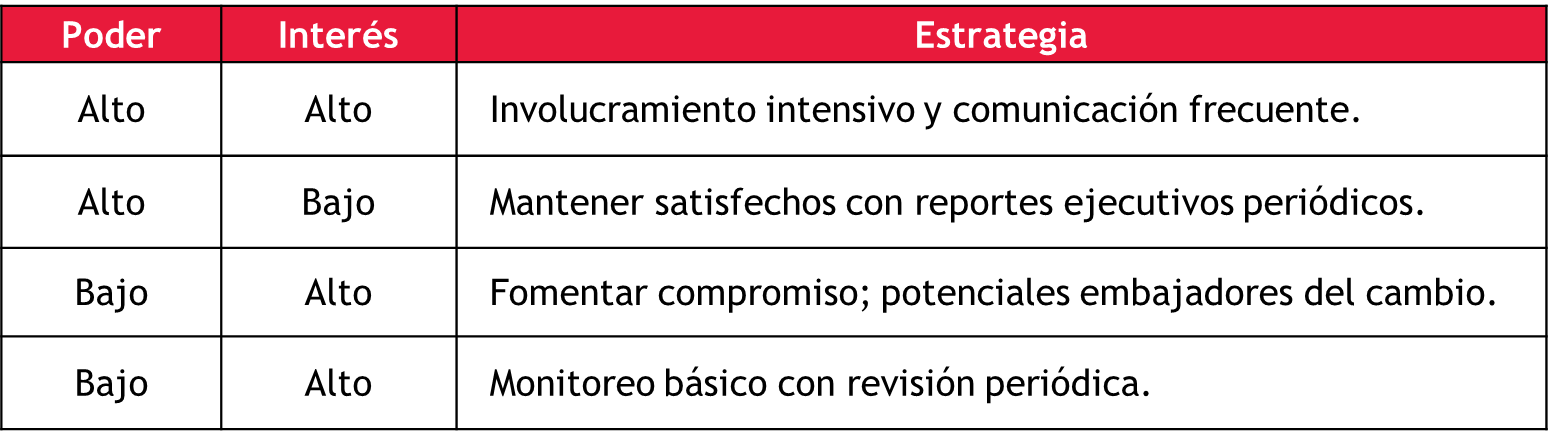 Lo esencial aquí es comprender que esta clasificación no es estática: los stakeholders cambian de cuadrante conforme evoluciona el proyecto o el contexto político y organizacional.