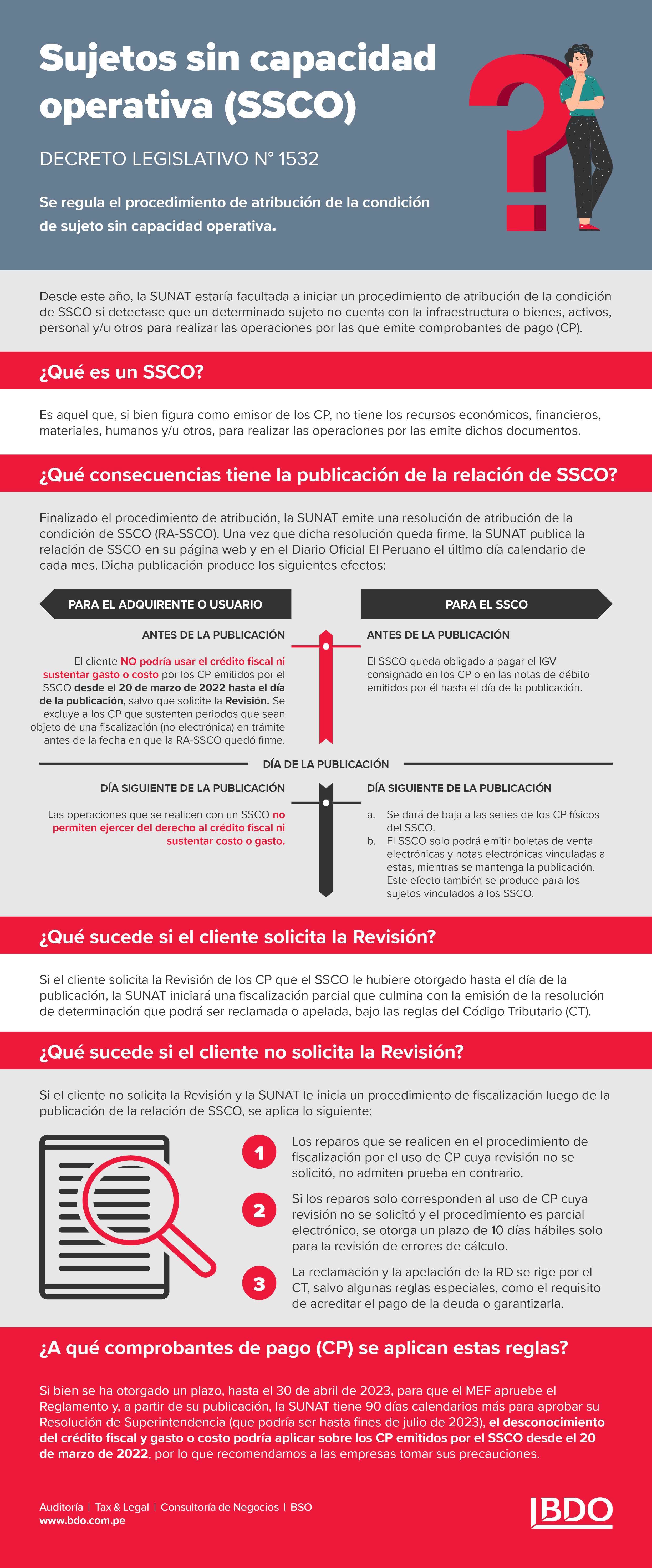 Con la finalidad de reducir la evasión tributaria en el país, el 1 de enero de 2023 entró en vigencia el Decreto Legislativo N° 1532, que regula el procedimiento de atribución de la condición de sujeto sin capacidad operativa (SSCO).