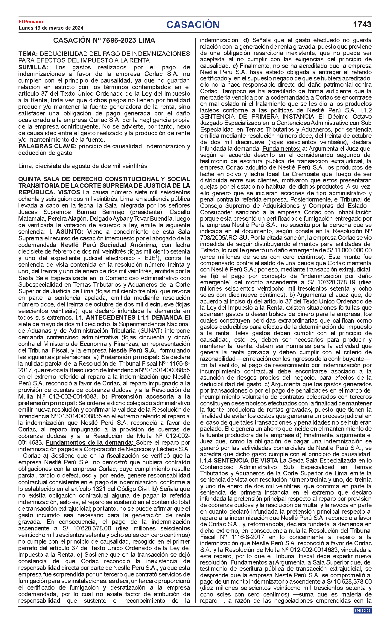 El 18/3/2024 se publicó en El Peruano la Casación N°7686-2023 , que resolvió el caso de una reconocida empresa de la industria alimentaria, confirmando el reparo al gasto por indemnizaciones pagadas por daño emergente, debido a que las mismas evidenciaban la 𝘍𝘢𝘭𝘵𝘢 𝘥𝘦 𝘋𝘪𝘭𝘪𝘨𝘦𝘯𝘤𝘪𝘢 o 𝘈𝘤𝘵𝘶𝘢𝘳 𝘯𝘦𝘨𝘭𝘪𝘨𝘦𝘯𝘵𝘦 de la empresa en el manejo de sus operaciones. (pág. 5)
